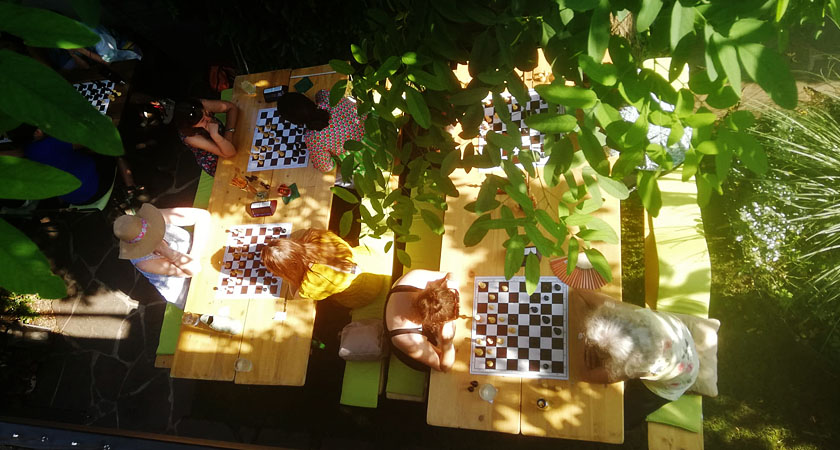 Inzwischen gibt es eine zweite Turnierreihe, die ich ins Leben gerufen habe, und zwar direkt hier in meinem Garten. Jedes Jahr in August finden sich, an einem Samstagnachmittag, bis zu 18 Frauen ein, die sich in einem Schnellschachformat um Feigenmarmelade, Schokolade und andere kleine Preise messen.